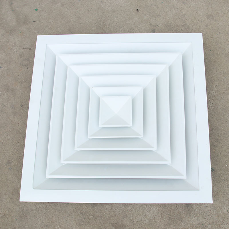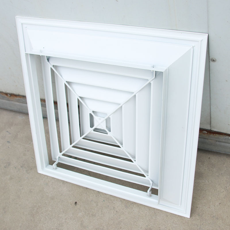 方型散流器使用該類型散流器時要與調節閥配合使用,才能在系統中得到理想的氣流分布。此風口的葉片角度為固定式,不能隨意調節,整個葉片與邊框采用分離結構。