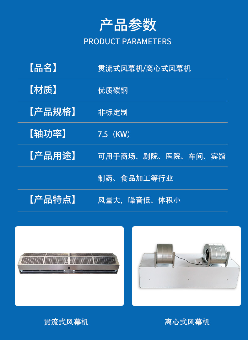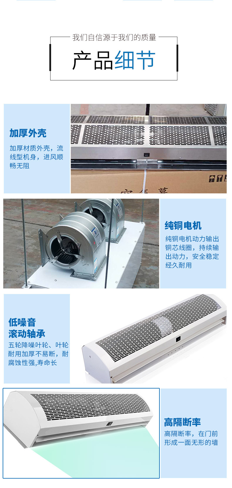 電加熱風幕機產生高速的氣流,將室內外分成兩個獨立溫度區域創造舒適的室內環境,保持室內空調及凈化空氣的效果,節省電能的同時,并令空氣循環,有效隔離灰塵、煙氣、臭氣 、昆蟲和微生物等。防止冷(暖)氣外流,節省用電持續形成的空氣門,能有效防止冷(暖)氣外泄,節省用電,將室內外分成兩個獨立溫度區域,在空調機長時間運轉時,輔助循環調節溫度,達到節約能源改善環境的目的。防塵、防蟲效果風幕機產生高速氣流,形成一道保護門,能有效阻擋室外灰塵及飛蟲侵入,保持室內清潔。防煙及有害氣體效果風幕機的空氣循環系統能令室內各角落強力阻隔油煙辛辣味的飄散及工業廢氣、汽車排氣等有害氣體進入室內。空氣循環效果在體育館、電影院、娛樂場所等因空間大而產生空調能量分配不均時,風幕機的空氣循環系統功能達到室內溫度均衡。