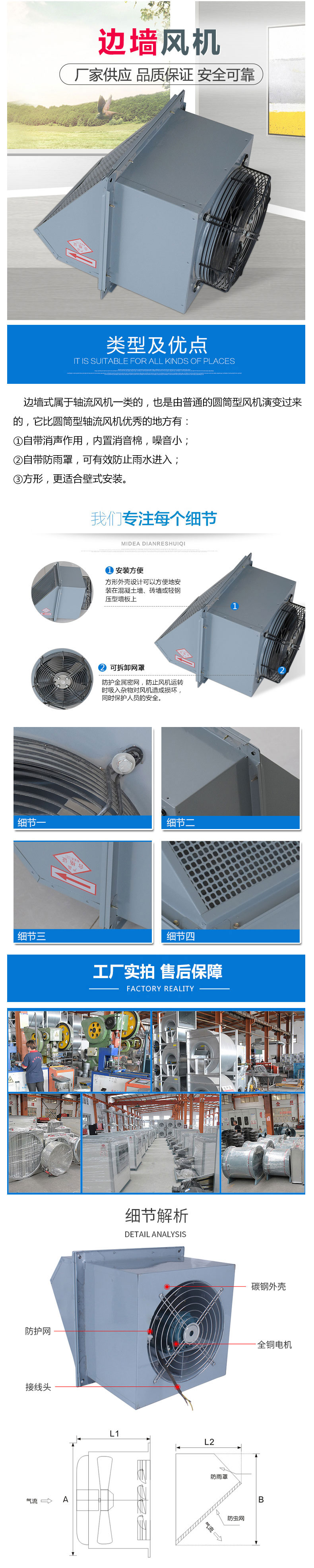 邊墻風(fēng)機(jī)采用的前掠型葉片、低噪音的外轉(zhuǎn)子或內(nèi)轉(zhuǎn)子風(fēng)機(jī)電機(jī)直聯(lián)傳動(dòng),方形外殼設(shè)計(jì)可以方便地安裝在混凝土墻、磚墻或輕鋼壓型墻板上,方形防雨罩結(jié) 構(gòu)牢固,外形美觀。具有噪聲低、風(fēng)量大、運(yùn)行可靠、性能參數(shù)范圍廣、安裝簡(jiǎn)便等特點(diǎn),廣泛應(yīng)用于廠礦企業(yè)車(chē)間和民用、商用建筑工程的邊墻壁式通風(fēng)換氣。根 據(jù)輸送介質(zhì)的要求,可制成防腐、防爆型。 WEX(DWEX)系列風(fēng)機(jī)一般用于邊墻壁式排風(fēng),配設(shè)45°防雨罩(或特殊制造成60°)和防蟲(chóng)網(wǎng)(夜間可防止昆蟲(chóng)循燈光飛入車(chē)間)??砂葱枰瞥蛇厜λ惋L(fēng)機(jī)型號(hào)為DWSP(WSP),配設(shè)90°防雨罩(防風(fēng)、雨、塵)和防蟲(chóng)網(wǎng)(夜間可防止昆蟲(chóng)循燈光飛入車(chē)間)。