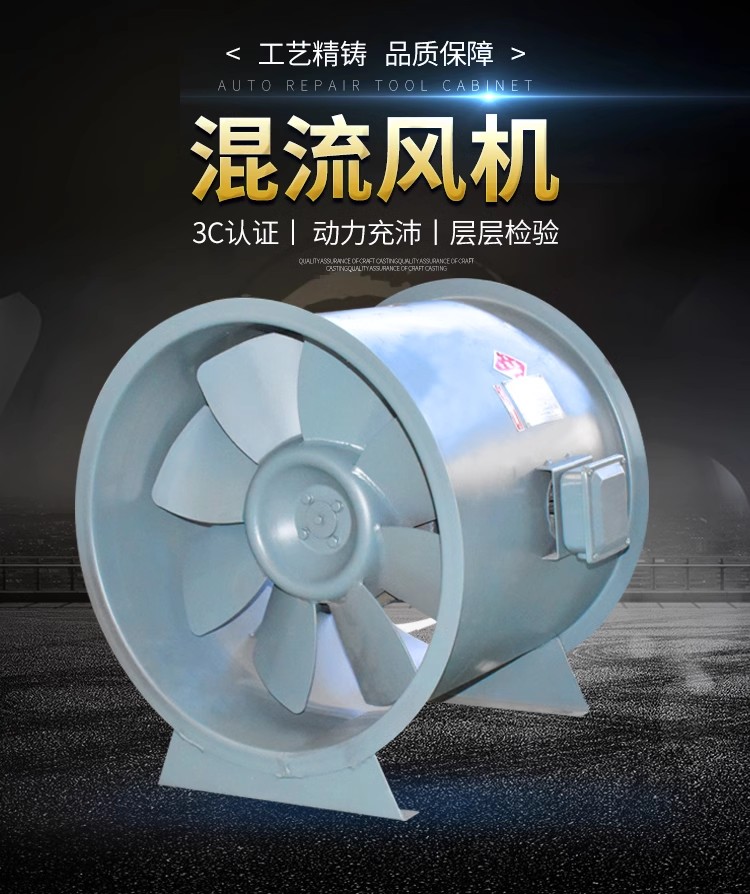 混流(斜流)風機,風壓系數比軸流風機高,流量系數比離心風機大,用在風壓和流量都“不大不小”的場合。它填補了軸流風機和離心風機之間的空白。同時具備安裝簡單方便的特點。